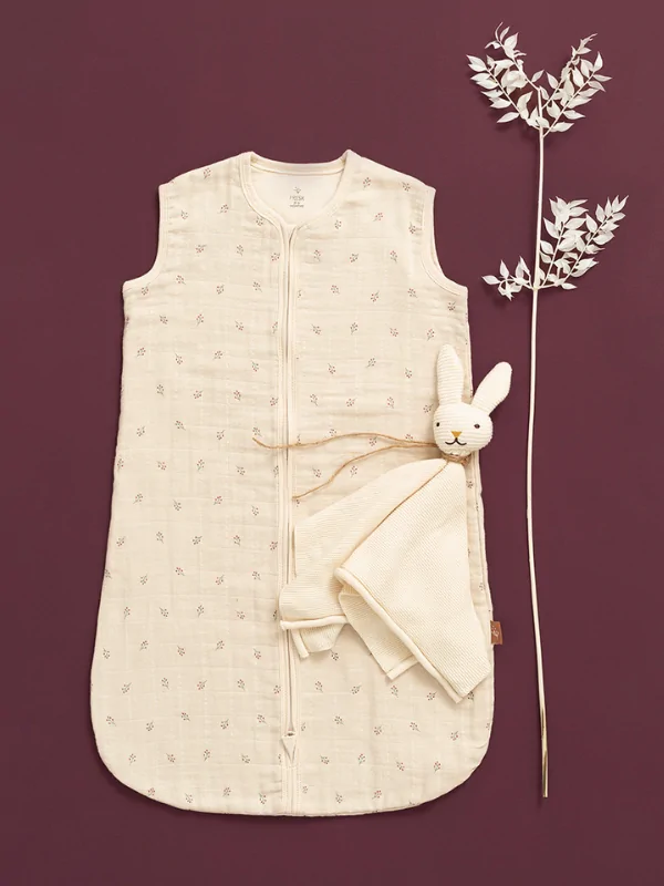 Pentru o temperatură de 22-23°C în cameră, un body cu mânecă scurtă sau lungă din bumbac este suficient pentru a fi purtat sub acest sac de dormit muselină 6-12 luni.